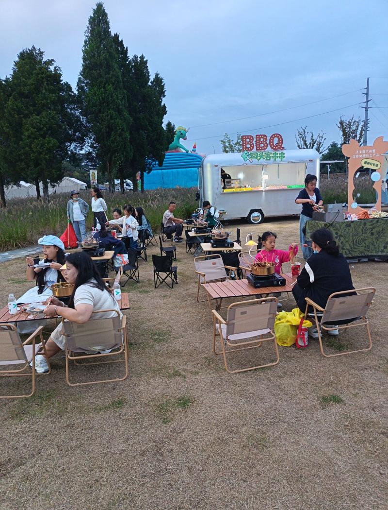 这个摊位占地足足五六十平方米,彻底打破了我头脑中串串摊必小巧的固有印象。草坪上,8张餐桌与32张躺椅错落分布,既方便食客用餐,又营造出轻松惬意的氛围。操作台上,各类食材堆得满满当当:有龙骨串、里脊肉、羊肉、牛肉,香甜的玉米,甚至还有特色的蚂蚱串……丰富的品类透着十足的诚意,显然是为国庆、中秋双节的消费高峰做好了充足的准备。