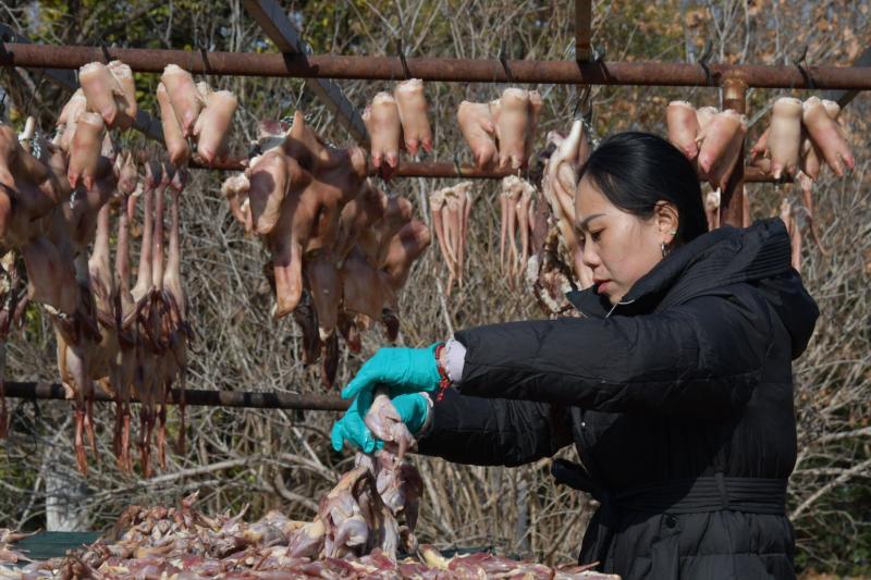2025年12月16日,淮安市洪泽区高良涧街道经营户趁着晴好天气,腌制晾晒咸鱼、咸肉、咸鹅等特色产品。